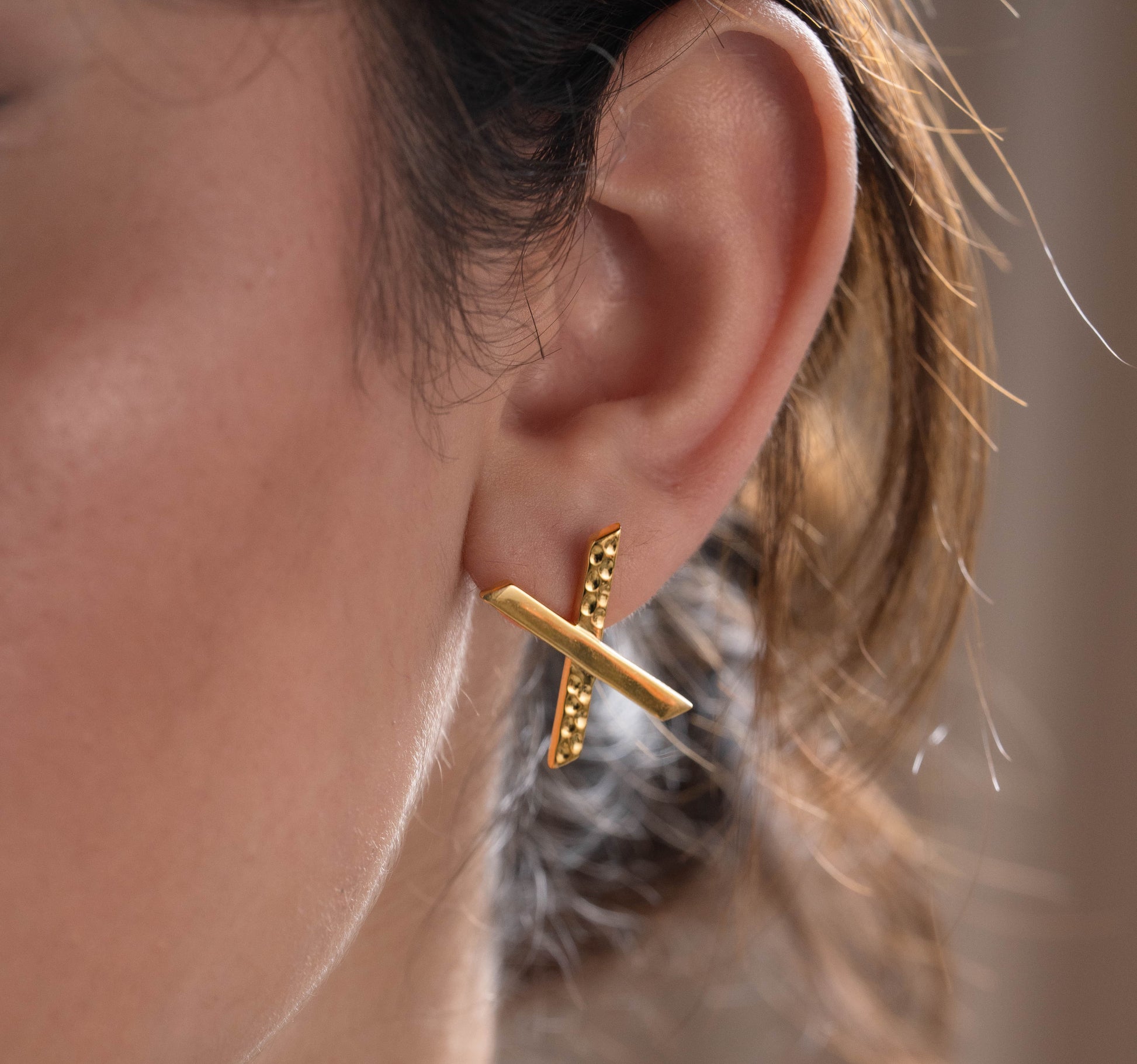 Crafted from recycled 925 Sterling Silver and plated with 25 layers of 18K gold, these earrings feature a hammered texture that gives them a striking, modern character.