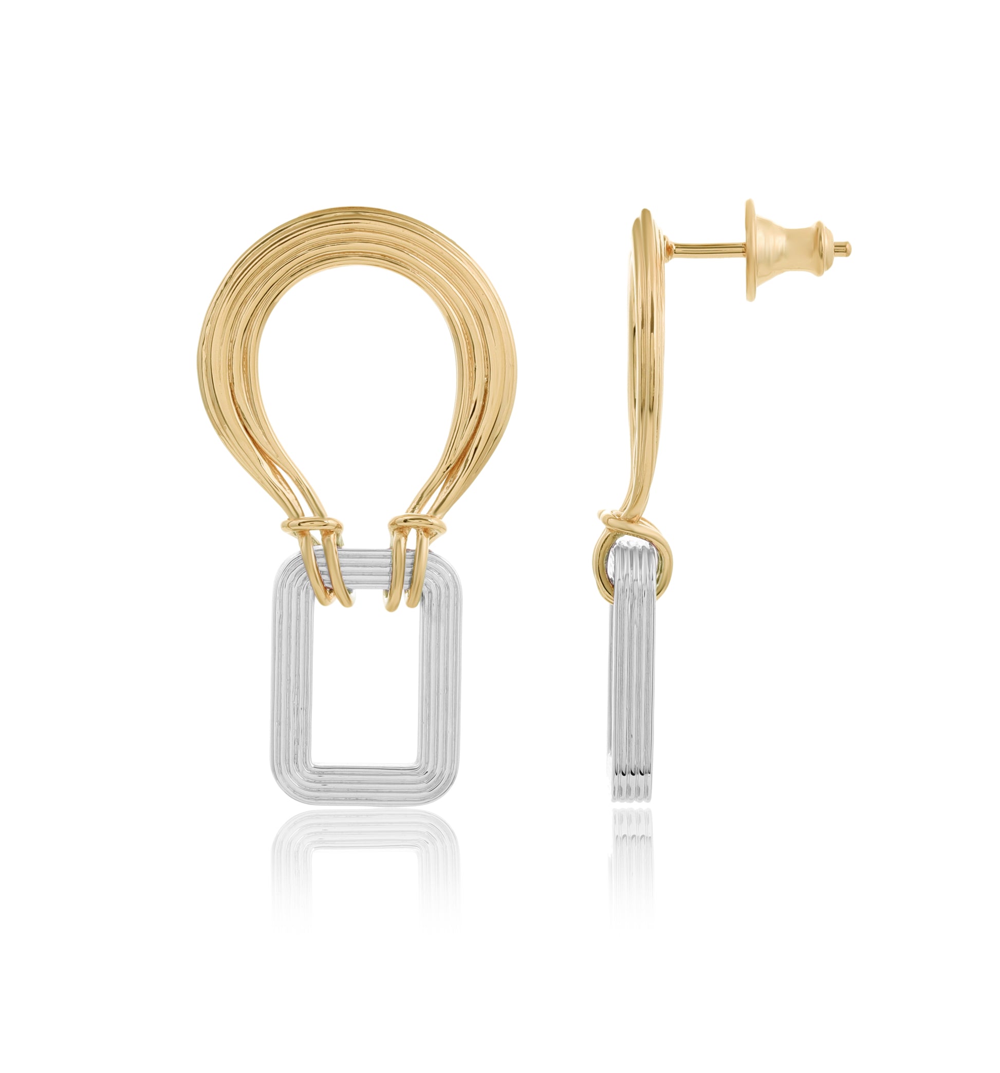 The Asha earrings unite the shine of 925 recycled sterling silver with the richness of 25 layers of recycled 18-karat gold plating, forming a design that feels like a miniature work of art. The upper section appears as a golden arch, composed of multiple fine, parallel strands that look as though they were hand-drawn, echoing the spirit of traditional wire craftsmanship. Suspended below is a polished silver rectangle, also formed from delicate wire layers, creating a striking contrast between gold and silver within a single piece.