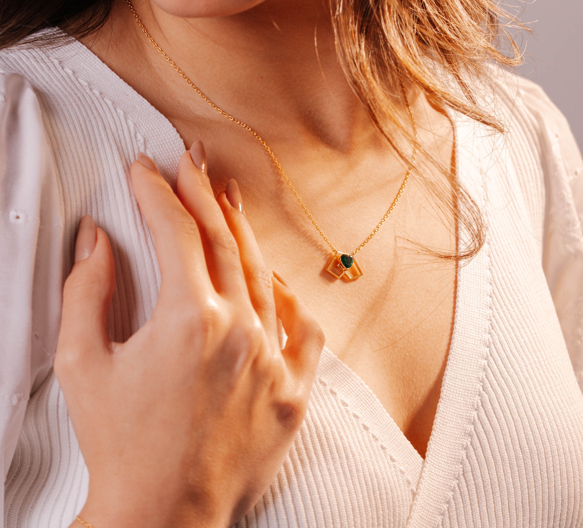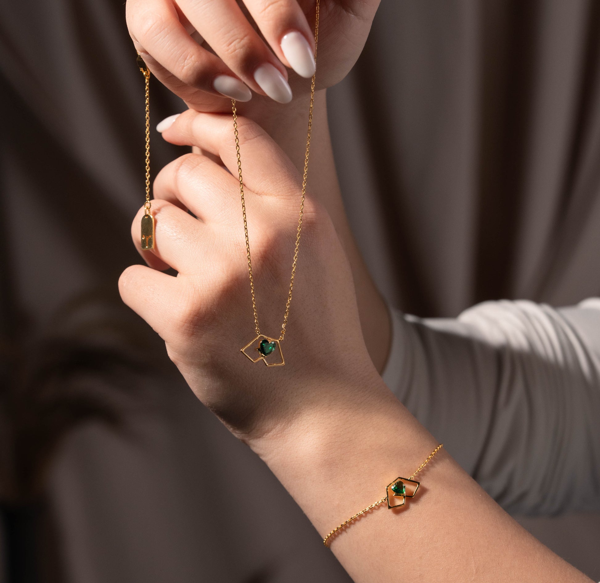 At the center of the necklace lies a geometric heart, embracing a vibrant emerald-green zirconia stone. The stone reflects light with a deep, lively brilliance that adds movement and allure to the piece. The fusion of geometric design, the lightness of gold, and the rich green hue creates a harmonious balance between modernity and symbolism.