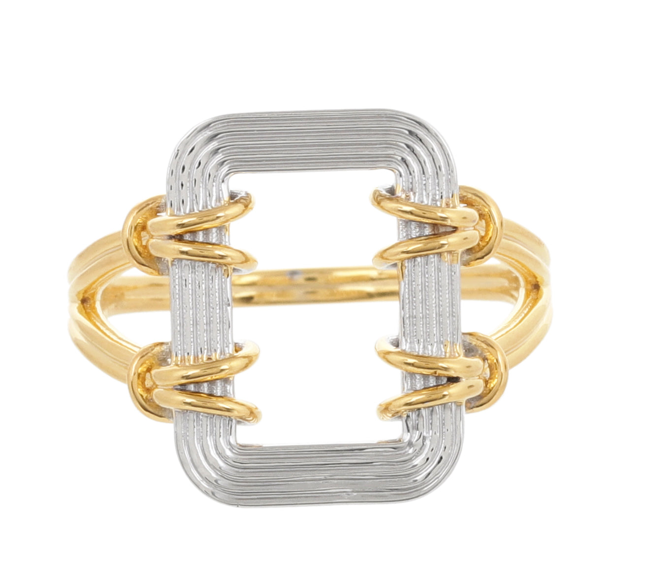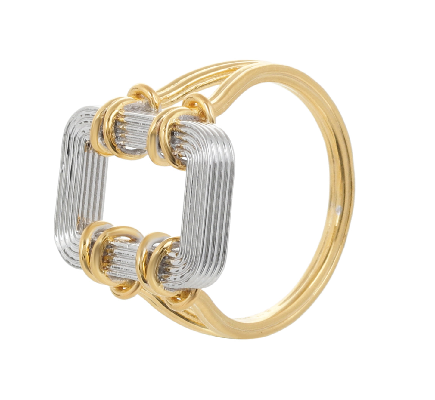 The Asha ring carries a strong artisanal spirit, as if sculpted from metal wires carefully reshaped into a square geometric frame that wraps lightly and elegantly around the finger. The ring features a harmonious blend of polished silver and yellow gold, with the edges and coiled wire details finished in 25 layers of recycled 18-karat gold plating over 925 recycled sterling silver, creating a distinctive two-tone look that highlights every detail with precision and adds a refined, luxurious touch.