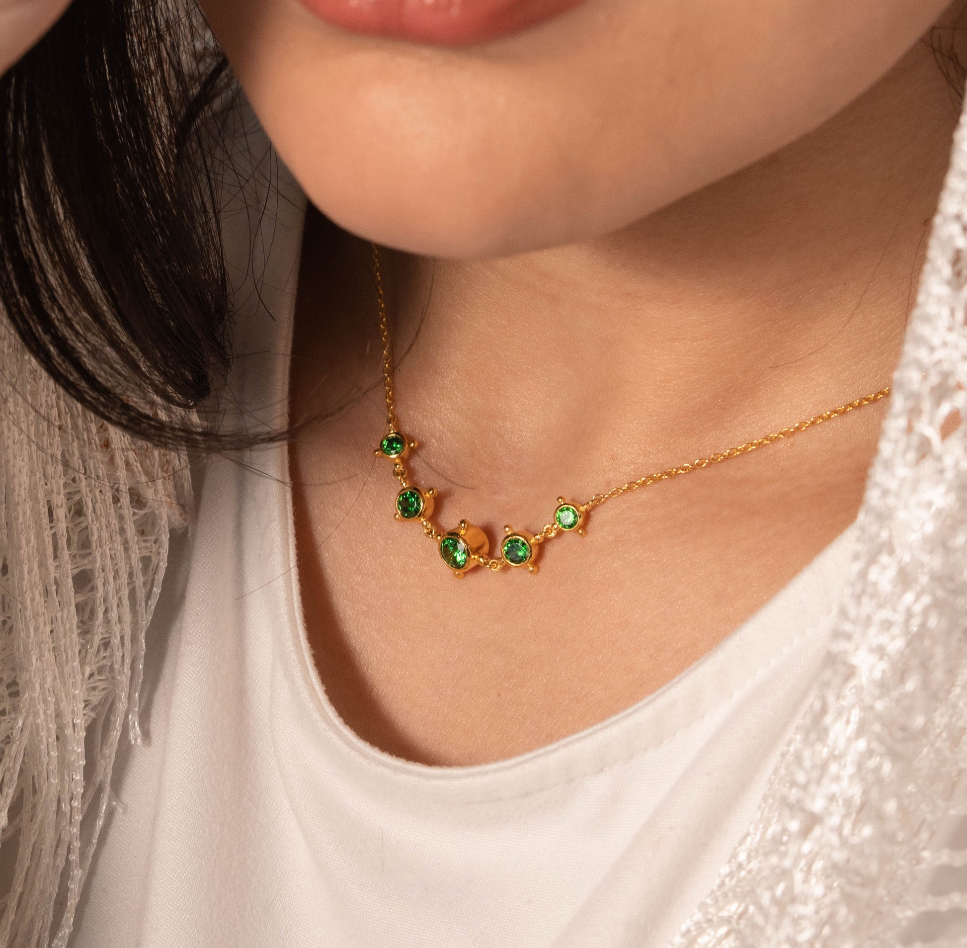 A necklace that flows along the neckline like a delicate line of light, set with five clear stones that shimmer softly, reminiscent of morning light reflecting on walls adorned with Aseer Al-Qatt art. Each stone is framed with subtle details inspired by traditional dots and motifs, reinterpreted with a light, contemporary touch.