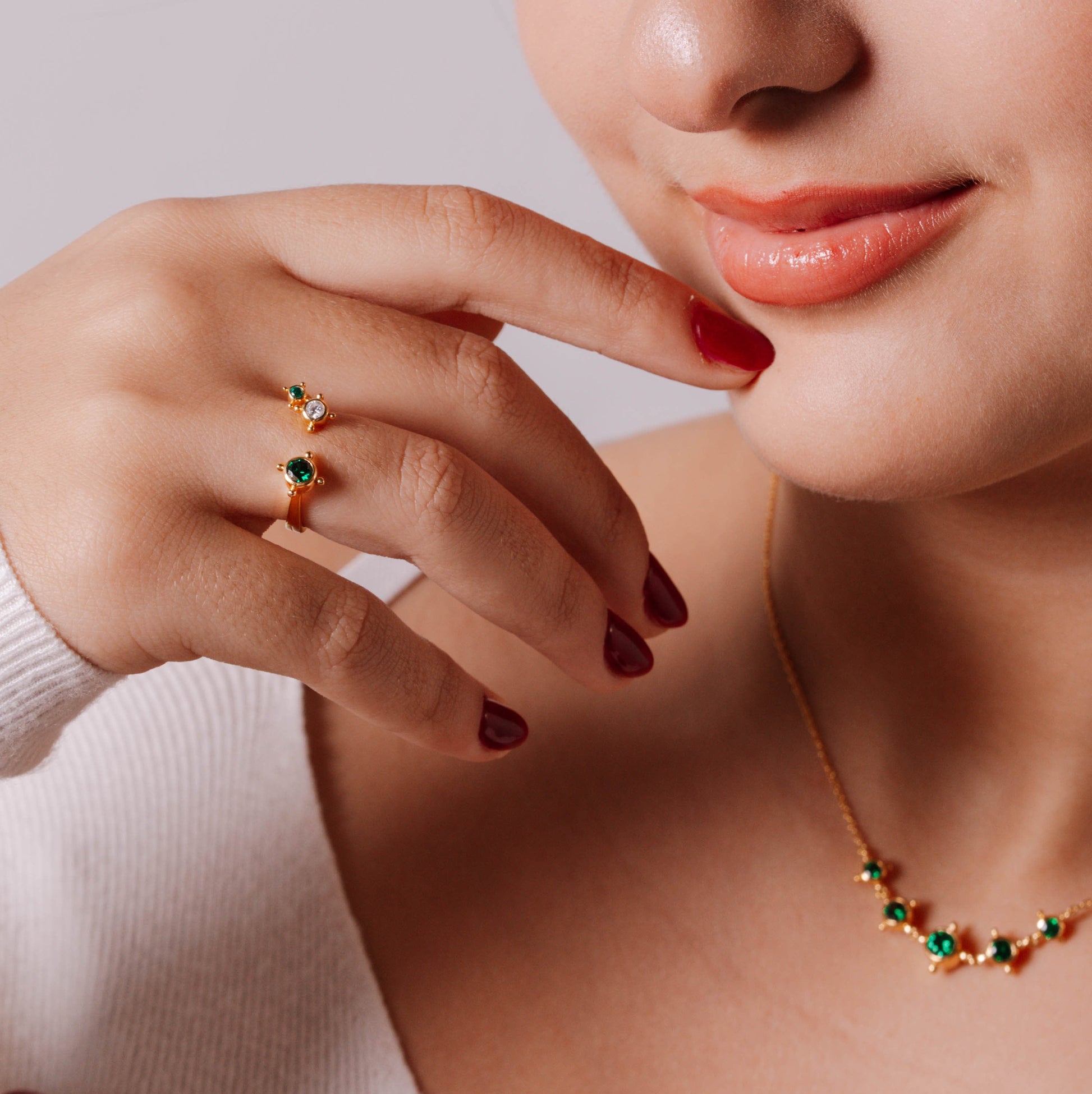 A ring that flows around the finger like a cool breeze, set with three clear stones that capture light effortlessly and return it with a soft, understated shimmer, never seeking attention, yet always seen. Its form is inspired by the details of Aseer Al-Qatt art, where dots and delicate symbols come together to create a language reminiscent of whispered stories.