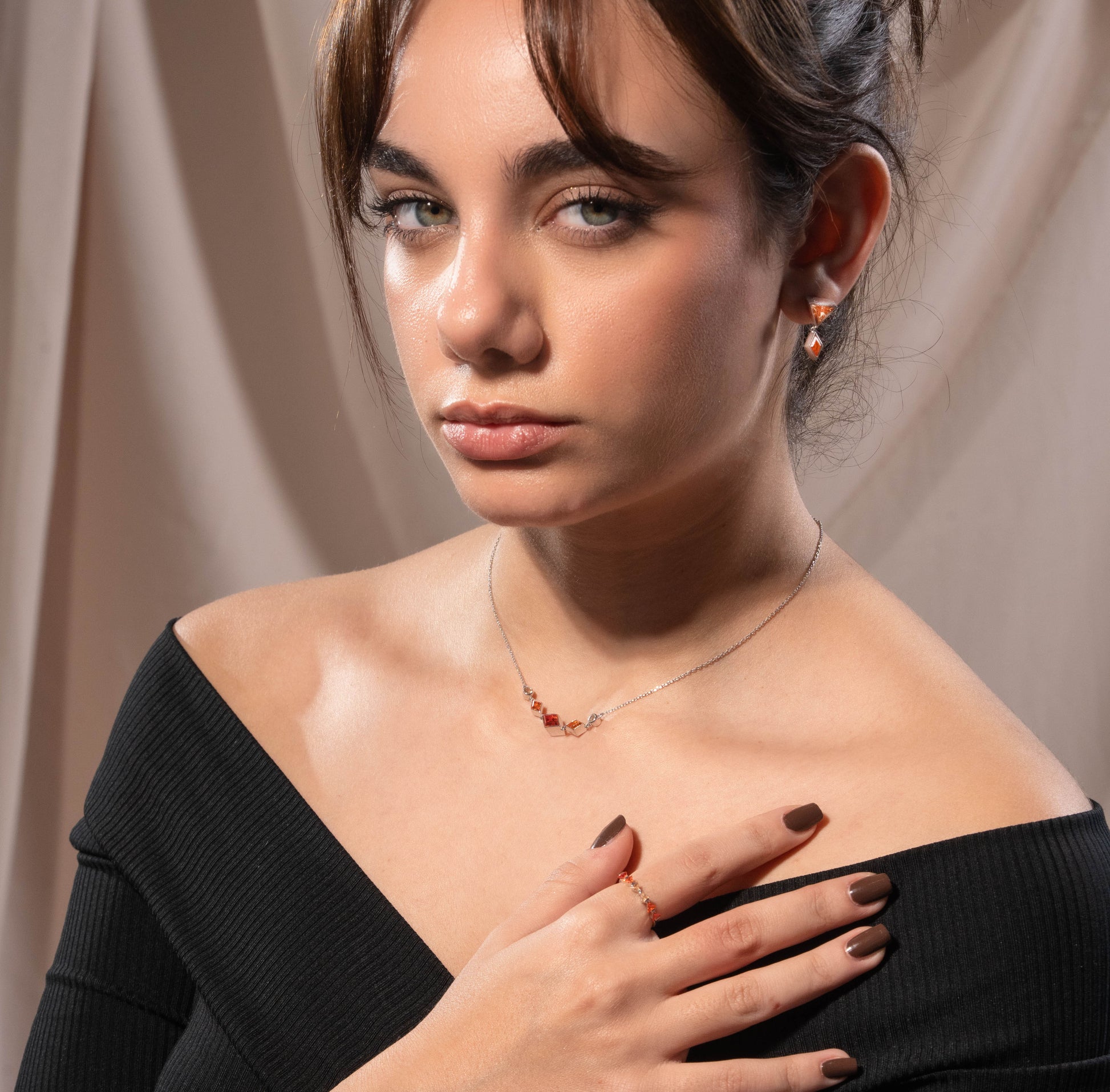 At the center of the necklace, a composition of geometric-cut stones comes together in warm color gradations of fiery orange and rich amber. Each stone reflects light with a distinct intensity, giving the necklace a warm, vibrant presence that contrasts elegantly with the cool brilliance of silver.
