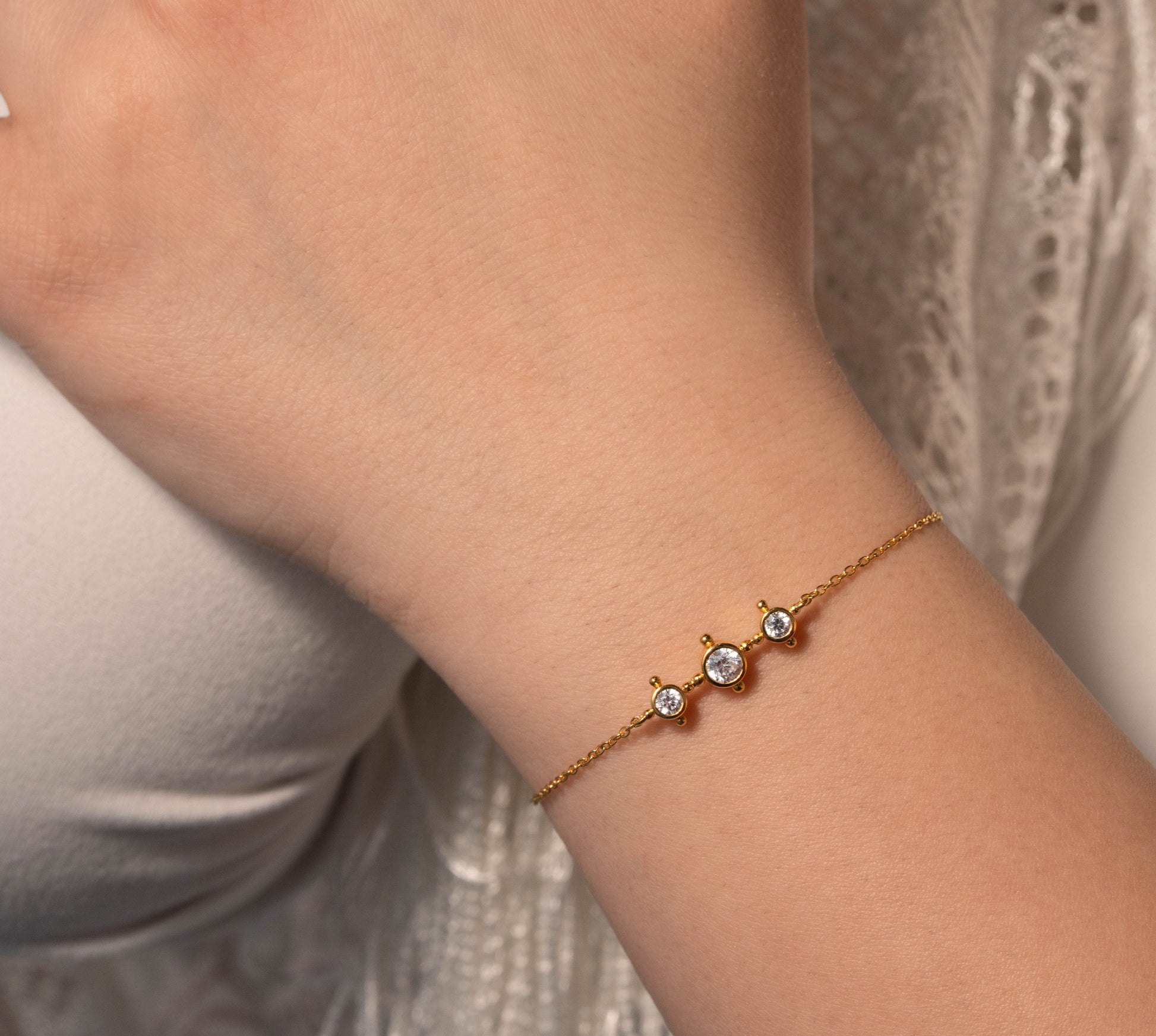 صُنع من فضّة عيار 925 معاد تدويرها، ومغلّف بطبقة روديوم ليحافظ على لمعانه الفضيّ الهادئ. السلسلة قابلة للتعديل، لتناسب مختلف المقاسات وتستقرّ برفق على اليد.