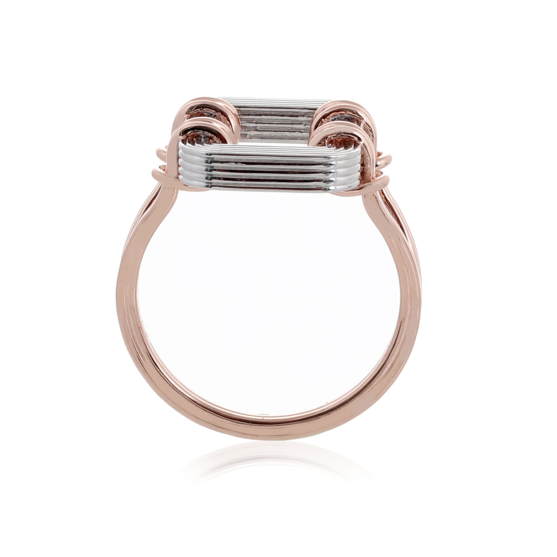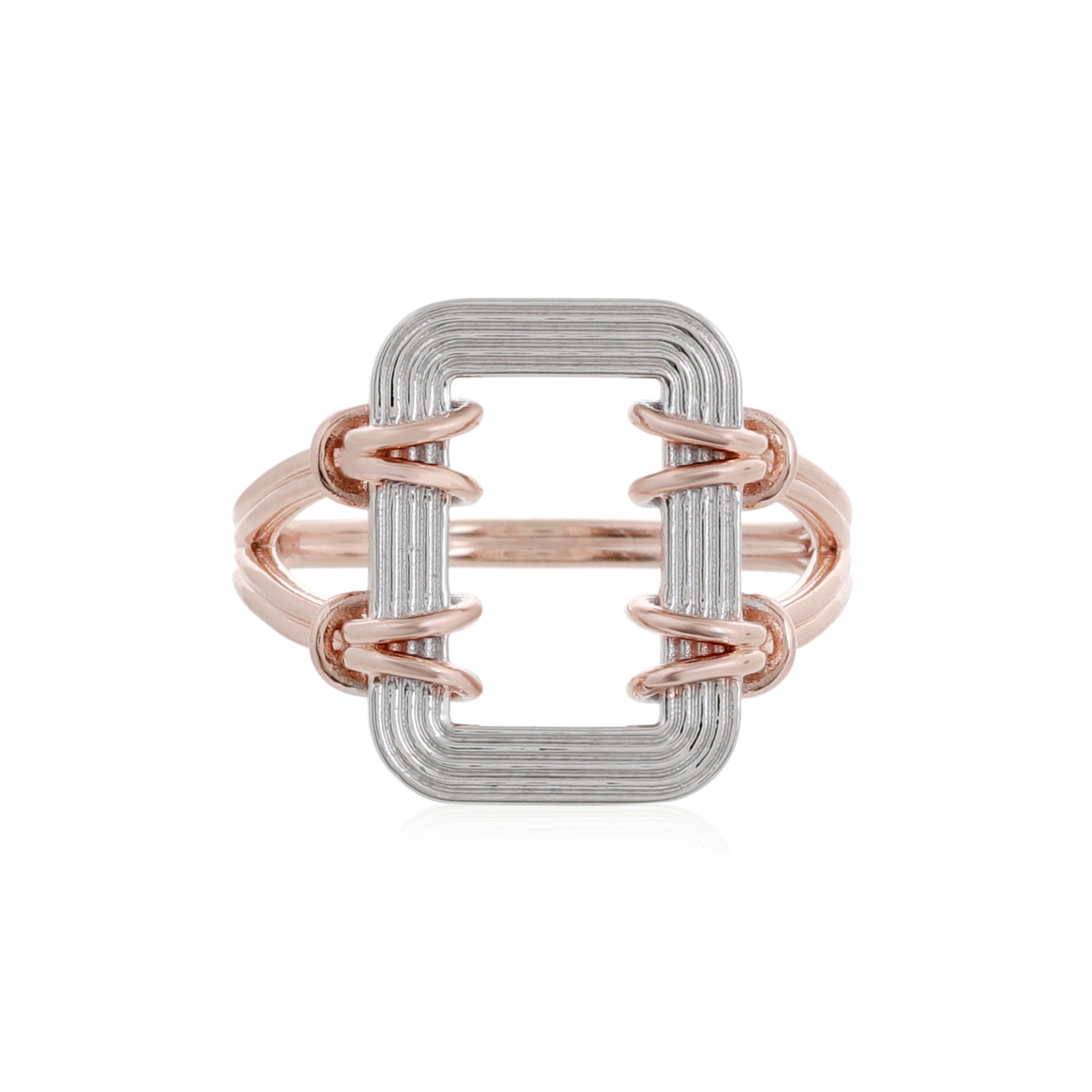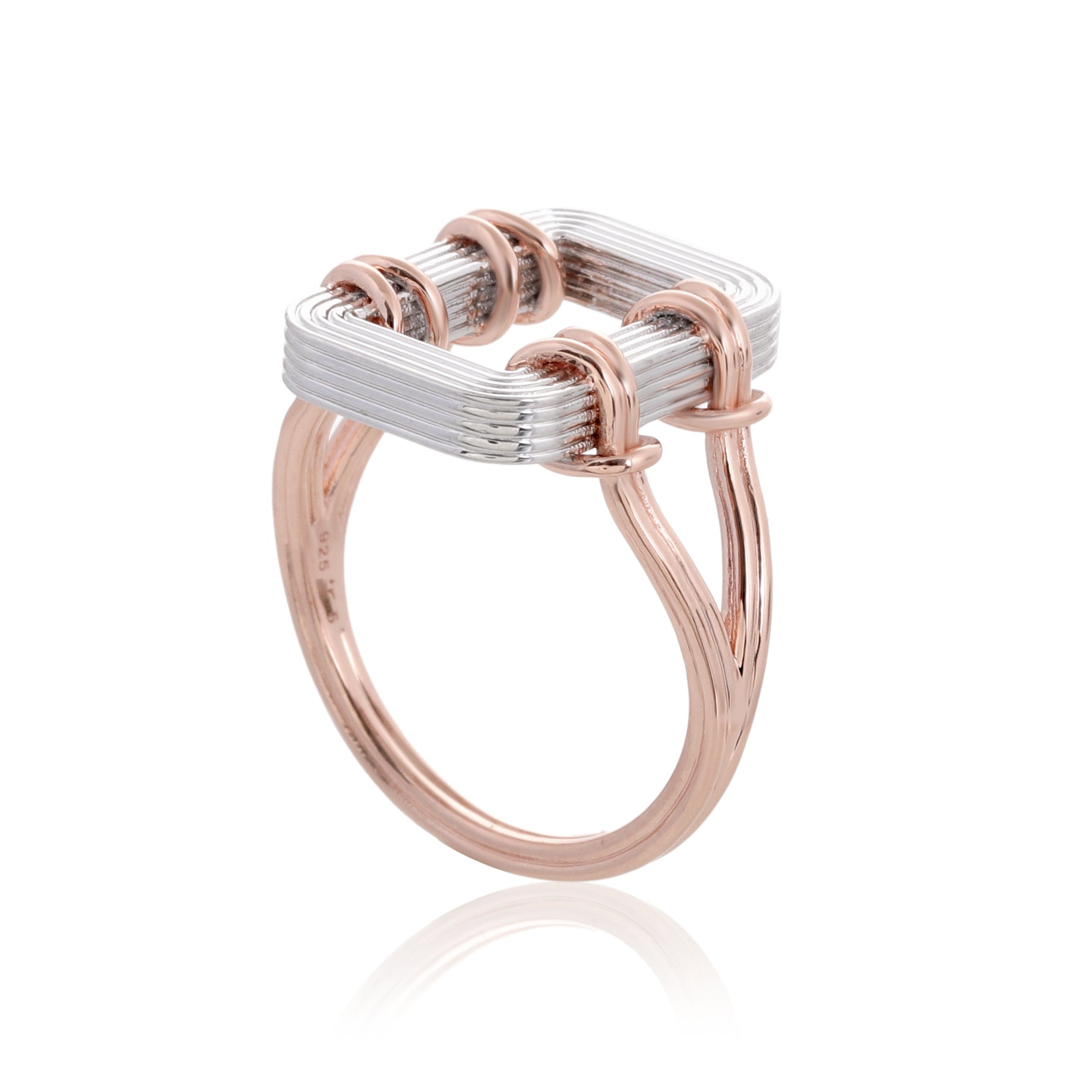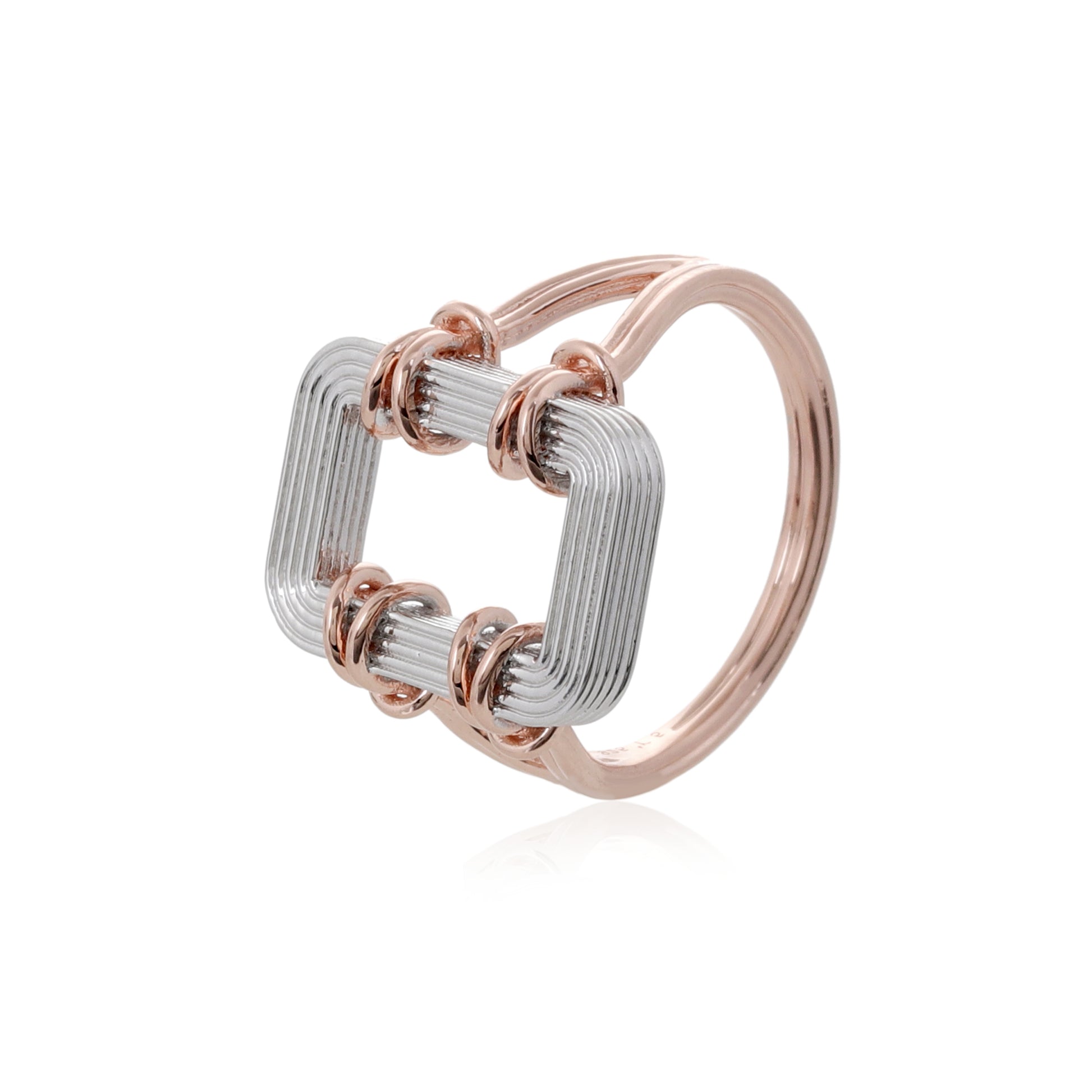 خاتم آشا يأتي بروح حرفية واضحة، وكأنه منحوت من أسلاكٍ معدنية أعيد تشكيلها بعناية ليأخذ هذا الإطار الهندسي المربع الذي يلتف حول الإصبع بخفة وأناقة. يتكوّن الخاتم من مزيج متناغم بين الفضة اللامعة والذهب الوردي، حيث تُصاغ الحواف والأسلاك الملفوفة ب 25 طبقة طلاء ذهب وردي عيار 18 معاد تدويره فوق فضة 925 مُعاد تدويرها، مما يمنحه مظهراً ثنائيّ اللون يبرز التفاصيل بدقة ويضيف لمسة فاخرة.